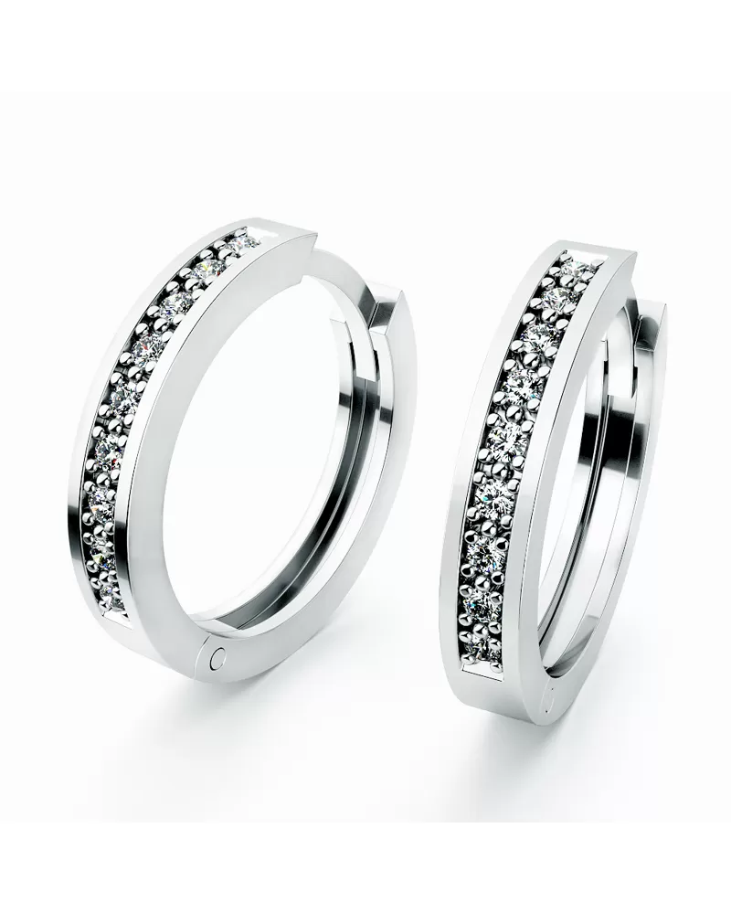 Náušnice kruhy patří mezi vůbec nejoblíbenější typ náušnic, náušnice jsou vhodné pro každodenní nošení i na společenské akce a sluší každé ženě! Tyto elegantní kruhy jsou vyrobeny z bílého čtrnáctikarátového zlata - 585/1000 v lesklé povrchové úpravě a s rovnou horní plochou. V náušnicích je vsazeno osmnáct kulatých diamantů v briliantovém brusu, který zajišťuje maximální brilanci vybroušených facet, dokonale odráží světlo a krásně září z každého úhlu pohledu! Vsazování diamantů provádějí naši nejzkušenější mistři zlatníci ručně pod mikroskopem s přesností na 0,01mm a proto nehrozí vypadnutí diamantů jako to bývá u strojně vyráběných šperků. Náušnice působí jemným a elegantním dojmem.