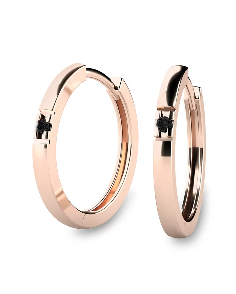 Náušnice kruhy patří mezi vůbec nejoblíbenější typ náušnic! Jsou vhodné pro každodenní nošení i na společenské akce a sluší každé ženě! Tyto elegantní kruhy jsou vyrobeny z růžového čtrnáctikarátového zlata - 585/1000 v lesklé povrchové úpravě a s půlkulatou horní plochou. V náušnicích jsou vsazeny dva kulaté diamanty černé barvy v briliantovém brusu. Diamanty jsou pevně uchyceny čtyřmi krapničkami v úrovni horní plochy náušnic takže nevystupují nad plochu náušnic a nezachytává se o ně! Vsazování diamantů provádějí naši nejzkušenější mistři zlatníci ručně pod mikroskopem s přesností na 0,01mm a proto nehrozí vypadnutí kamínků jako to bývá u strojně vyráběných šperků. Náušnice působí jemným a elegantním dojmem.
