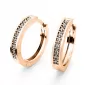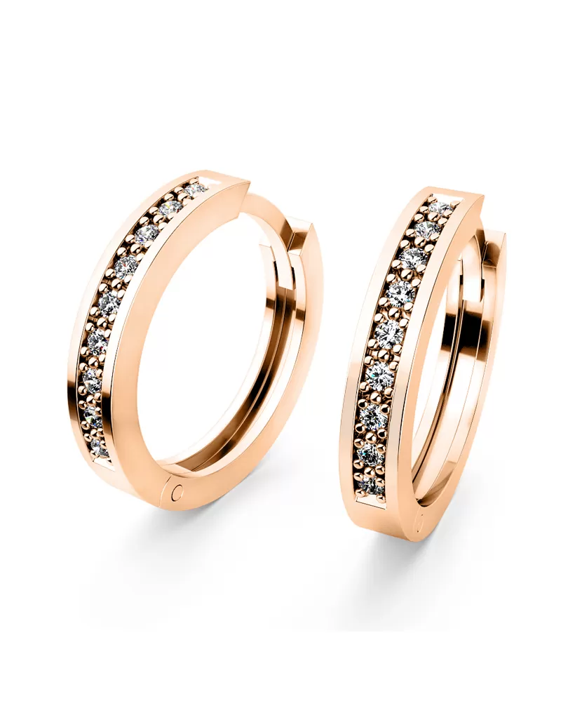 Náušnice kruhy patří mezi vůbec nejoblíbenější typ náušnic, náušnice jsou vhodné pro každodenní nošení i na společenské akce a sluší každé ženě! Tyto elegantní kruhy jsou vyrobeny z růžového čtrnáctikarátového zlata - 585/1000 v lesklé povrchové úpravě a s rovnou horní plochou. V náušnicích je vsazeno osmnáct kulatých diamantů v briliantovém brusu, který zajišťuje maximální brilanci vybroušených facet, dokonale odráží světlo a krásně září z každého úhlu pohledu! Vsazování diamantů provádějí naši nejzkušenější mistři zlatníci ručně pod mikroskopem s přesností na 0,01mm a proto nehrozí vypadnutí diamantů jako to bývá u strojně vyráběných šperků. Náušnice působí jemným a elegantním dojmem.