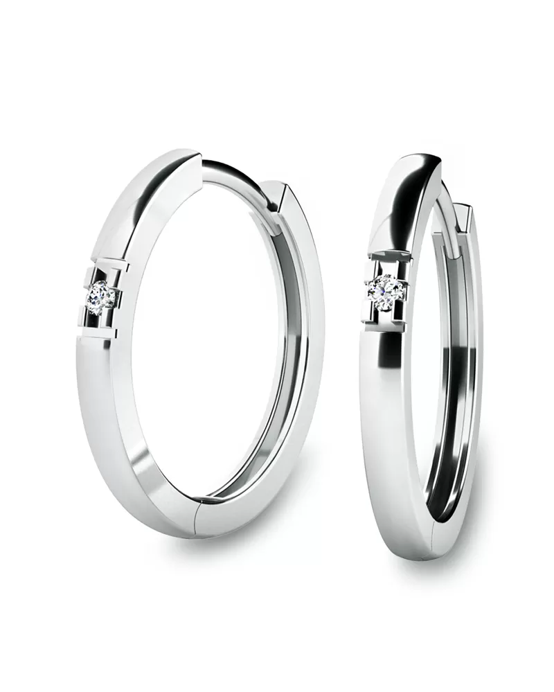 Náušnice kruhy patří mezi vůbec nejoblíbenější typ náušnic! Jsou vhodné pro každodenní nošení i na společenské akce a sluší každé ženě! Tyto elegantní kruhy jsou vyrobeny z bílého čtrnáctikarátového zlata - 585/1000 v lesklé povrchové úpravě a s  půlkulatou horní plochou. V náušnicích jsou vsazeny dva kulaté diamanty v briliantovém brusu, který zajišťuje maximální brilanci vybroušených facet, dokonale odráží světlo a krásně září z každého úhlu pohledu! Diamanty jsou pevně uchyceny čtyřmi krapničkami v úrovni horní plochy náušnic takže nevystupují nad plochu náušnic a nezachytává se o ně! Vsazování diamantů provádějí naši nejzkušenější mistři zlatníci ručně pod mikroskopem s přesností na 0,01mm a proto nehrozí vypadnutí kamínků jako to bývá u strojně vyráběných šperků. Náušnice působí jemným a elegantním dojmem.