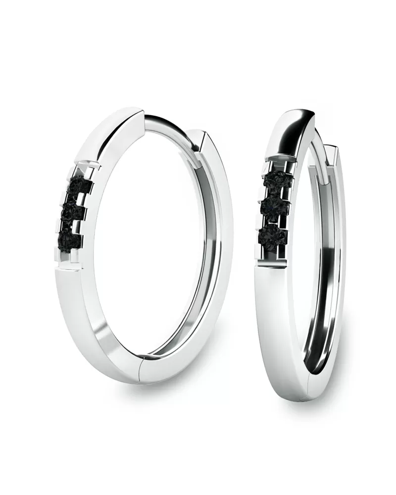 Náušnice kruhy patří mezi vůbec nejoblíbenější typ náušnic! Jsou vhodné pro každodenní nošení i na společenské akce a sluší každé ženě! Tyto elegantní kruhy jsou vyrobeny z bílého čtrnáctikarátového zlata - 585/1000 v lesklé povrchové úpravě a s půlkulatou horní plochou. V náušnicích je vsazeno šest kulatých diamantů černé barvy v briliantovém brusu. Každý diamant je pevně uchycený čtyřmi krapnami v úrovni horní plochy náušnic takže nevystupují nad plochu náušnic a nezachytává se o ně! Vsazování diamantů provádějí naši nejzkušenější mistři zlatníci ručně pod mikroskopem s přesností na 0,01mm a proto nehrozí vypadnutí kamínků jako to bývá u strojně vyráběných šperků. Náušnice působí jemným a elegantním dojmem.