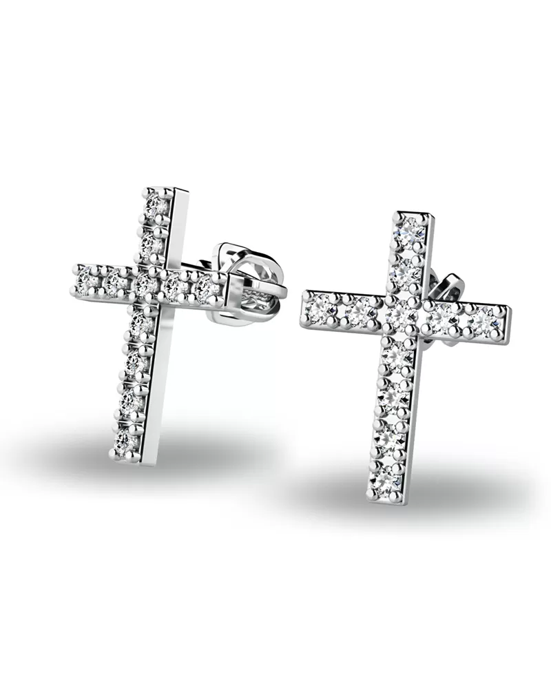 Náušnice v tvare krížikov sú v celej ploche posádzané diamantmi, vďaka skladbe a štýlovo čistému vsadeniu diamantov vynikajú krížiky krásnou brilanciou kameňov! Tieto náušnice sú vyrobené z bieleho štrnásťkarátového zlata - 585/1000 a sú celé v lesklej povrchovej úprave. V náušniciach je vsadených 22 ks diamantov briliantového brusu, ktorý im dodáva dokonalú brilanciu, skvele odráža svetlo a september! Vsadzovanie diamantov vykonávajú naši najskúsenejší majstri zlatníci ručne pod mikroskopom s presnosťou na 0,01 mm a preto nehrozí vypadnutie kamienkov ako to býva u strojne vyrábaných náušníc. Zapínanie náušníc je na skrutky a balóniky.