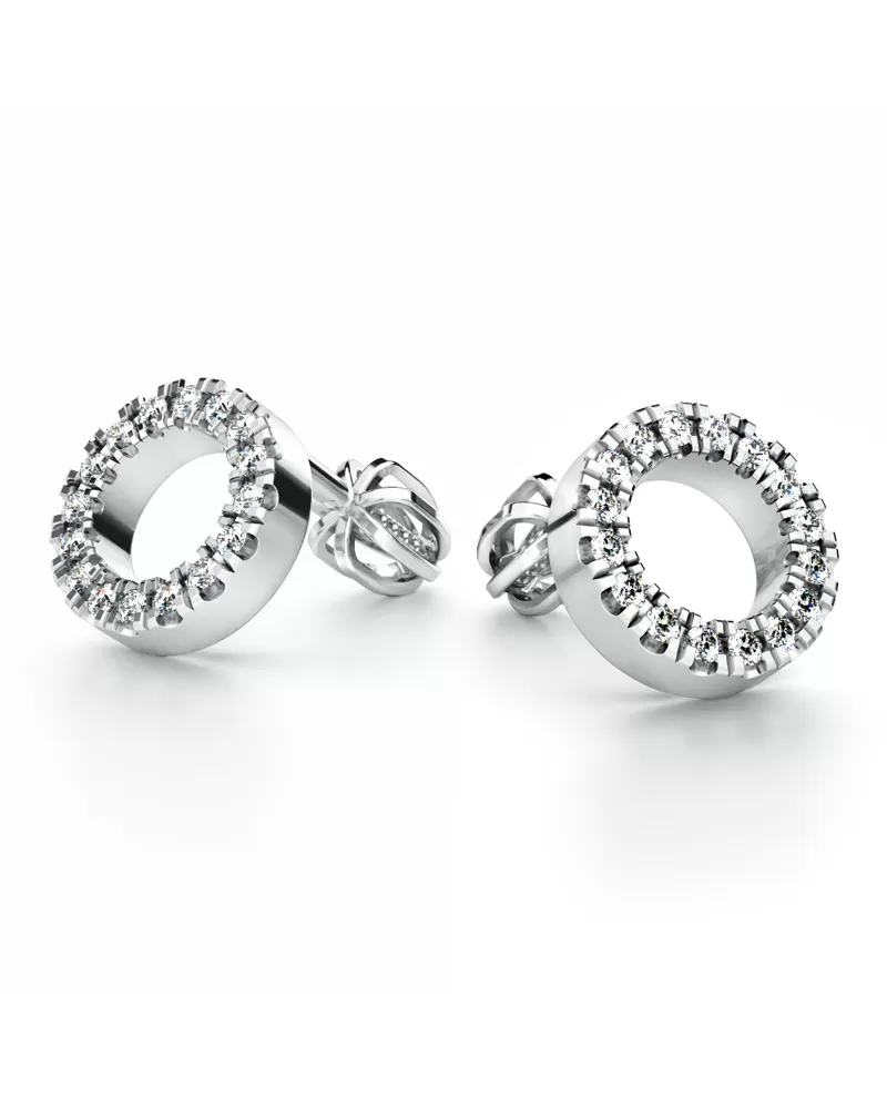 Náušnice "pecky" v tvare krúžkov tzn. že náušnice sú priamo na uchu, patria stále medzi najobľúbenejšie typy náušníc. Sú vyrobené z bieleho štrnásťkarátového zlata - 585/1000 a sú celé v lesklej povrchovej úprave. V každej náušnici je vsadených šestnásť okrúhlych diamantov briliantového brusu, ktorý im dodáva dokonalú brilanciu, skvele odráža svetlo a žiari z každého uhla pohľadu! Vsadzovanie diamantov vykonávajú naši najskúsenejší majstri zlatníci ručne pod mikroskopom s presnosťou na 0,01 mm a preto nehrozí vypadnutie kamienkov ako to býva u strojne vyrábaných náušníc. Zapínanie náušníc je na bezpečné skrutky a balóniky.
