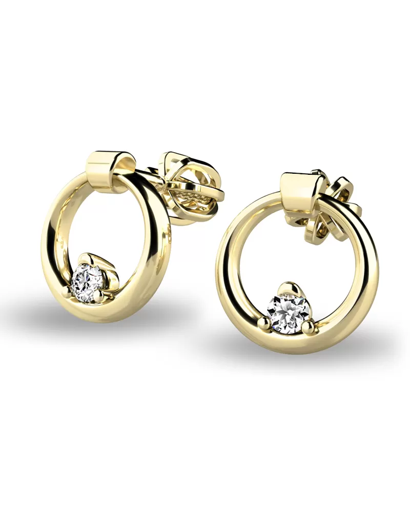 Náušnice sú čistého dizajnu v modernom prevedení, ktoré patria k najobľúbenejším typom. Tieto náušnice sú vyrobené zo žltého štrnásťkarátového zlata - 585/1000 a sú celé v lesklej povrchovej úprave. Náušnice sú zdobené dvoma diamantmi briliantového brusu, ktorý im dodáva dokonalú brilanciu, skvele odráža svetlo a september! Vsadzovanie diamantov vykonávajú naši najskúsenejší majstri zlatníci ručne pod mikroskopom s presnosťou na 0,01 mm a preto nehrozí vypadnutie kamienkov ako to býva u strojne vyrábaných náušníc. Zapínanie náušníc je na skrutky a balóniky.