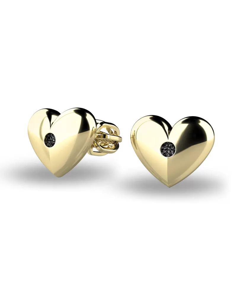 Náušnice "pecky" v tvare srdiečok tzn. že náušnice sú priamo na uchu, patria stále medzi najobľúbenejšie typy náušníc. Sú vyrobené zo žltého štrnásťkarátového zlata - 585/1000 a sú celé v lesklej povrchovej úprave. V každej náušnici je vsadený jeden okrúhly čierny diamant briliantového brusu. Náušnice vynikajú krásnym kontrastom žltého zlata a čierneho diamantu! Vsadzovanie diamantov vykonávajú naši najskúsenejší majstri zlatníci ručne pod mikroskopom s presnosťou na 0,01 mm a preto nehrozí vypadnutie kamienkov ako to býva u strojne vyrábaných náušníc. Zapínanie náušníc je na skrutky a balóniky.
