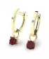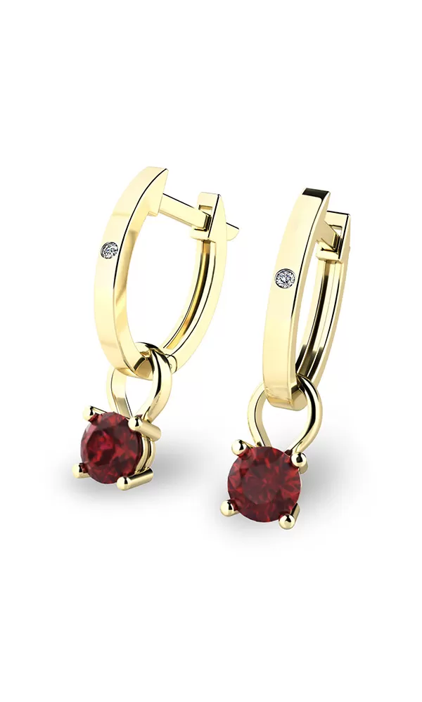 Jemné náušnice - oválky jsou vhodné pro každodenní nošení i na společenské akce a jistě budou slušet každé ženě. Tento model je zdoben dvěma menšími kulatými diamanty a zavěšenými korunkami osazenými granáty v rudé barvě. Všechny kameny jsou v briliantovém brusu, který dodává kamenům maximální brilanci a lesk. Vsazování diamantů a drahých kamenů provádějí naši nejzkušenější mistři zlatníci ručně pod mikroskopem s přesností na 0,01mm a proto nehrozí vypadnutí kamínků jako to bývá u strojně vyráběných náušnic. Tyto elegantní náušnice jsou vyrobeny ze žlutého čtrnáctikarátového zlata - 585/1000 v lesklé povrchové úpravě.