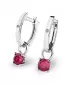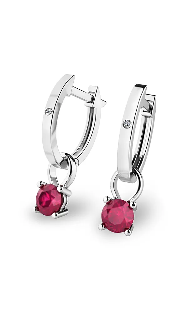 Jemné náušnice - oválky jsou vhodné pro každodenní nošení i na společenské akce a jistě budou slušet každé ženě. Tento model je zdoben dvěma menšími kulatými diamanty a zavěšenými korunkami osazenými rubíny v červené barvě. Všechny kameny jsou v briliantovém brusu, který dodává kamenům maximální brilanci a lesk. Tyto elegantní náušnice jsou vyrobeny z bílého čtrnáctikarátového zlata - 585/1000 v lesklé povrchové úpravě.