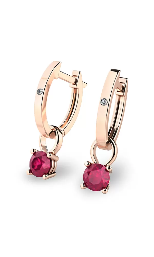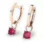 Jemné náušnice - oválky jsou vhodné pro každodenní nošení i na společenské akce a jistě budou slušet každé ženě. Tento model je zdoben dvěma menšími kulatými diamanty a zavěšenými korunkami osazenými rubíny v červené barvě. Všechny kameny jsou v briliantovém brusu, který dodává kamenům maximální brilanci a lesk. Tyto elegantní náušnice jsou vyrobeny z růžového čtrnáctikarátového zlata - 585/1000 v lesklé povrchové úpravě.
