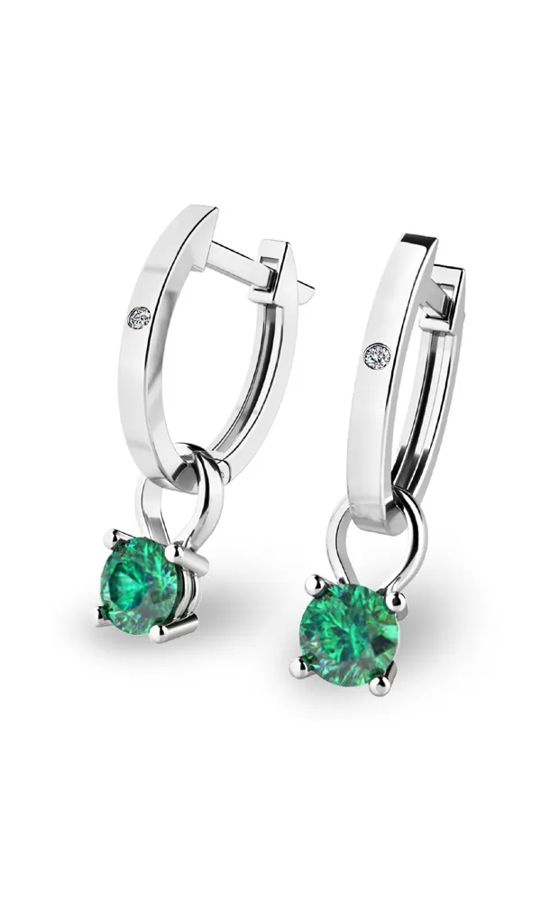 Jemné náušnice - oválky jsou vhodné pro každodenní nošení i na společenské akce a jistě budou slušet každé ženě. Tento model je zdoben dvěma menšími kulatými diamanty a zavěšenými korunkami osazenými zelenými smaragdy. Všechny kameny jsou v briliantovém brusu, který dodává kamenům maximální brilanci a lesk. Tyto elegantní náušnice jsou vyrobeny z bílého čtrnáctikarátového zlata - 585/1000 v lesklé povrchové úpravě.