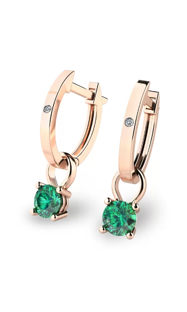 Jemné náušnice - oválky jsou vhodné pro každodenní nošení i na společenské akce a jistě budou slušet každé ženě. Tento model je zdoben dvěma menšími kulatými diamanty a zavěšenými korunkami osazenými zelenými smaragdy. Všechny kameny jsou v briliantovém brusu, který dodává kamenům maximální brilanci a lesk. Tyto elegantní náušnice jsou vyrobeny z růžového čtrnáctikarátového zlata - 585/1000 v lesklé povrchové úpravě.