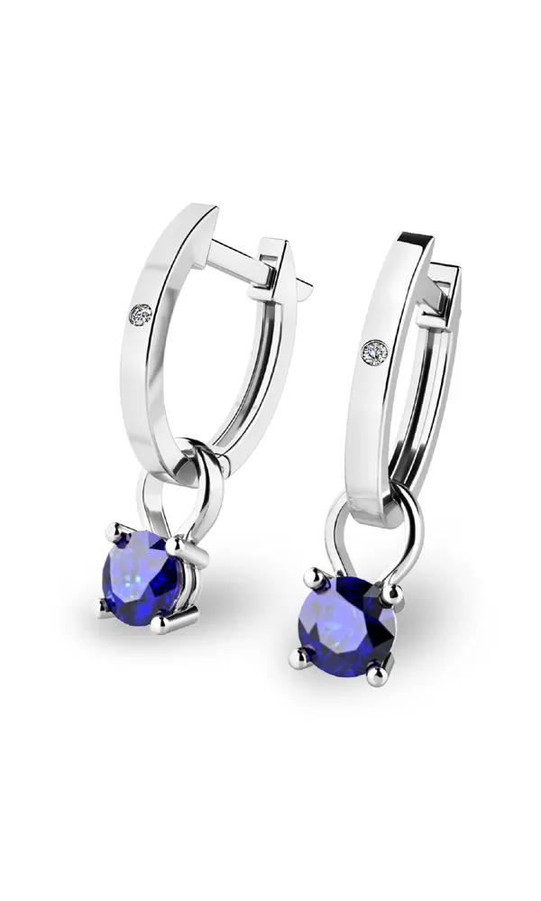 Jemné náušnice - oválky jsou vhodné pro každodenní nošení i na společenské akce a jistě budou slušet každé ženě. Tento model je zdoben dvěma menšími kulatými diamanty a zavěšenými korunkami osazenými modrými safíry. Všechny kameny jsou v briliantovém brusu, který dodává kamenům maximální brilanci a lesk. Tyto elegantní náušnice jsou vyrobeny z bílého čtrnáctikarátového zlata - 585/1000 v lesklé povrchové úpravě.