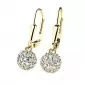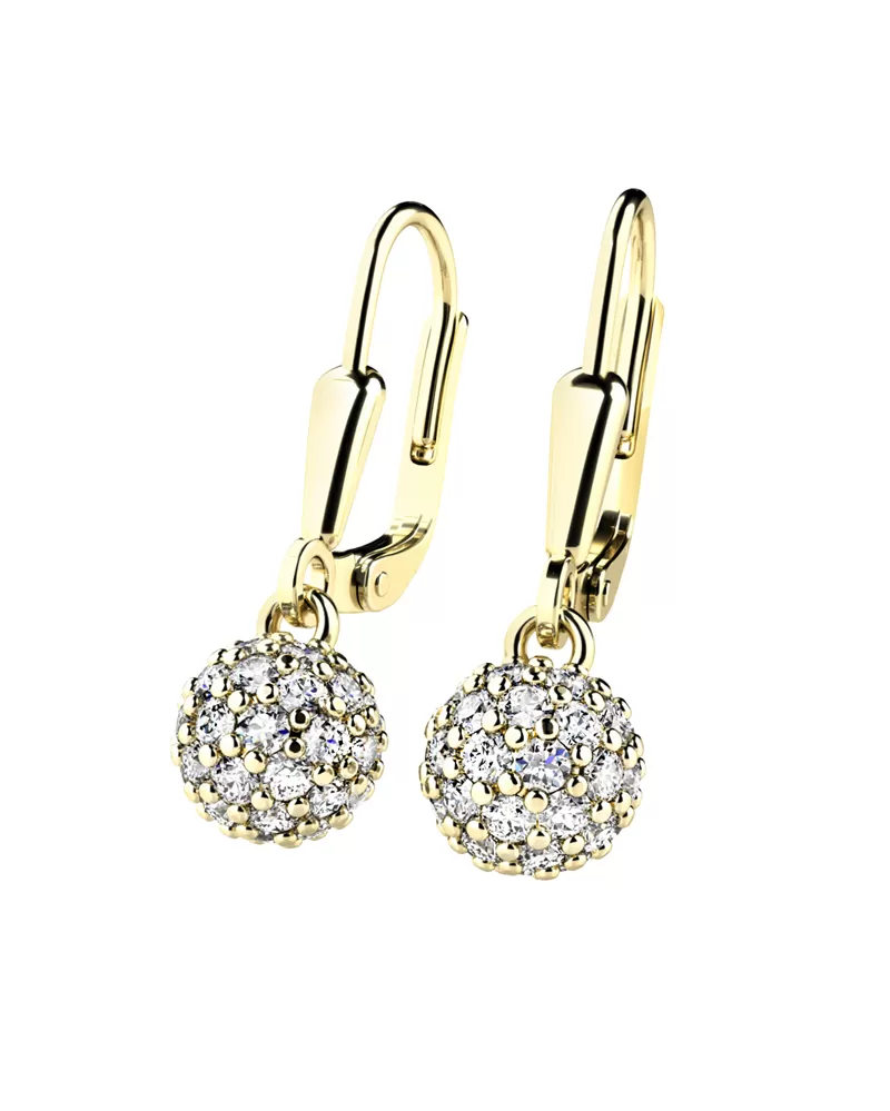Náušnice guličky sú v celej ploche posádzané diamantmi, vďaka skladbe a štýlovo čistému vsadeniu diamantov vynikajú guličky krásnou brilanciou kameňov! Tieto náušnice sú vyrobené zo žltého štrnásťkarátového zlata - 585/1000 a sú v lesklej povrchovej úprave. V náušniciach je vsadených 82 ks diamantov briliantového brusu, ktorý im dodáva dokonalú brilanciu, skvele odráža svetlo a krásne žiari z každého uhla pohľadu! Vsadzovanie diamantov vykonávajú naši najskúsenejší majstri zlatníci ručne pod mikroskopom s presnosťou na 0,01 mm a preto nehrozí vypadnutie kamienkov ako to býva u strojne vyrábaných náušníc. Zapínanie náušníc je na klapky.