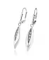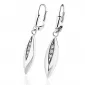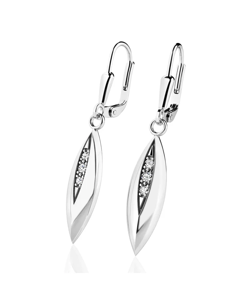 Visiace náušnice podlhovastého tvaru, ktoré sú v stredovej časti osadené diamantmi. Vďaka skladbe a štýlovo čistému vsadeniu diamantov vynikajú náušnice krásnou brilanciou kameňov! Tieto náušnice sú vyrobené z bieleho štrnásťkarátového zlata - 585/1000 a sú v lesklej povrchovej úprave. V náušniciach je vsadených šesť diamantov briliantového brusu, ktorý im dodáva dokonalú brilanciu, skvele odráža svetlo a krásne žiari z každého uhla pohľadu! Vsadzovanie diamantov vykonávajú naši najskúsenejší majstri zlatníci ručne pod mikroskopom s presnosťou na 0,01 mm a preto nehrozí vypadnutie kamienkov ako to býva u strojne vyrábaných náušníc. Zapínanie náušníc je na klapky.