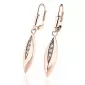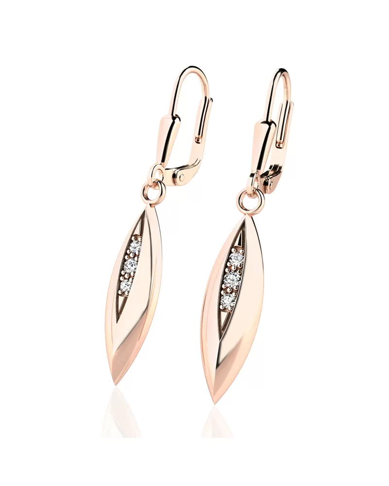 Visiace náušnice podlhovastého tvaru, ktoré sú v stredovej časti osadené diamantmi. Vďaka skladbe a štýlovo čistému vsadeniu diamantov vynikajú náušnice krásnou brilanciou kameňov! Tieto náušnice sú vyrobené z ružového štrnásťkarátového zlata - 585/1000 a sú v lesklej povrchovej úprave. V náušniciach je vsadených šesť diamantov briliantového brusu, ktorý im dodáva dokonalú brilanciu, skvele odráža svetlo a krásne žiari z každého uhla pohľadu! Vsadzovanie diamantov vykonávajú naši najskúsenejší majstri zlatníci ručne pod mikroskopom s presnosťou na 0,01 mm a preto nehrozí vypadnutie kamienkov ako to býva u strojne vyrábaných náušníc. Zapínanie náušníc je na klapky.