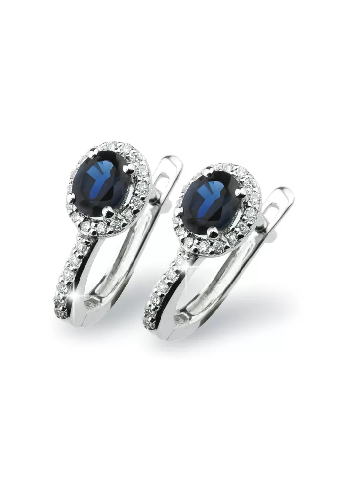 Nádherné dámske náušnice vyrobené z bieleho štrnásťkarátového zlata rýdzosti 585/1000 v lesklej povrchovej úprave s oválnymi prírodnými zafírmi a diamantmi. Diamanty sú vybrúsené briliantovým brusom, ktorý zaisťuje maximálnu brilanciu vybrúsených facet, dokonale odráža svetlo a neuveriteľne žiari z každého uhla pohľadu! Práca zlatníka je tak mimoriadna, že môžete vidieť dokonalé usadenie každého briliantu. Celé náušnice pôsobia dokonalým a luxusným dojmom!