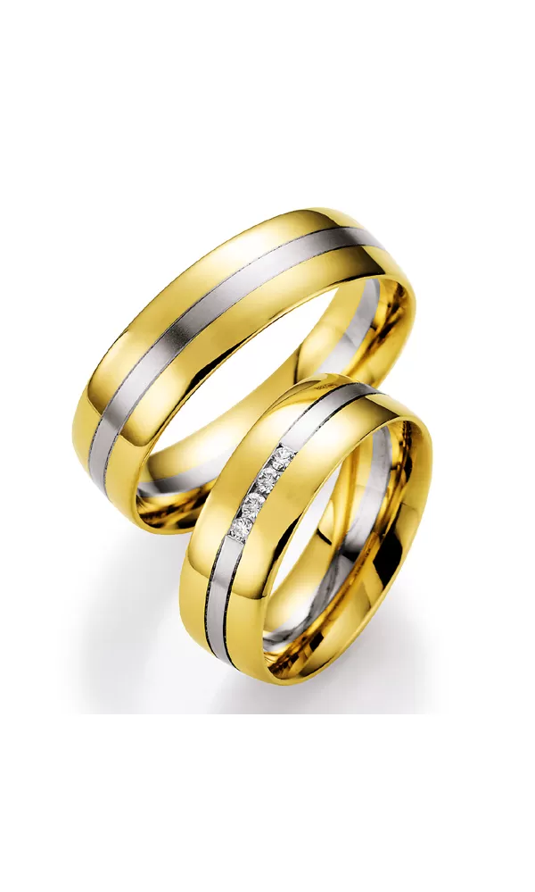 Zlaté snubné prstene vyrobené v kombinácii bieleho a žltého štrnásťtikarátového zlata - 585/000 v rovnom profile v povrchovej úprave zamatový mat na strednej časti - krajky lesklé oddelené jemnými ryhami. V dámskom prsteni sú vsadené štyri okrúhle diamanty briliantového brusu. Diamanty oplývajú svojou krásou a vlastnosťami, ktoré sú oproti iným kameňom bezkonkurenčné. Je to najtvrdší nerast, ktorý nikdy nestratí svoju hodnotu. Diamant je kráľ všetkých drahokamov a teda aj jedným z najcennejších a preto sa oplatí do šperkov s diamantmi investovať a predovšetkým pri snubných prsteňoch, ktoré sú na celý život!  Vsadzovanie diamantov vykonávajú naši najskúsenejší majstri zlatníci ručne pod mikroskopom s presnosťou na 0,01 mm a preto nehrozí vypadnutie kamienkov ako to býva u strojne vyrábaných snubných prsteňov. Snubné prstene majú vnútorný fit profil - zaoblenie vnútornej strany prsteňov.