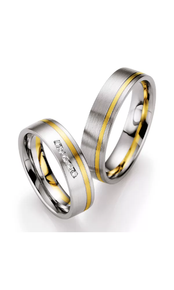 Zlaté snubné prstene vyrobené v kombinácii bieleho a žltého štrnásťtikarátového zlata - 585/000 v rovnom profile v povrchovej úprave zamatový mat. V dámskom prsteni je vsadených päť okrúhlych diamantov briliantového brusu. Diamanty oplývajú svojou krásou a vlastnosťami, ktoré sú oproti iným kameňom bezkonkurenčné. Je to najtvrdší nerast, ktorý nikdy nestratí svoju hodnotu. Diamant je kráľ všetkých drahokamov a teda aj jedným z najcennejších a preto sa oplatí do šperkov s diamantmi investovať a predovšetkým pri snubných prsteňoch, ktoré sú na celý život!  Vsadzovanie diamantov vykonávajú naši najskúsenejší majstri zlatníci ručne pod mikroskopom s presnosťou na 0,01 mm a preto nehrozí vypadnutie kamienkov ako to býva u strojne vyrábaných snubných prsteňov. Snubné prstene majú vnútorný fit profil - zaoblenie vnútornej strany prsteňov.