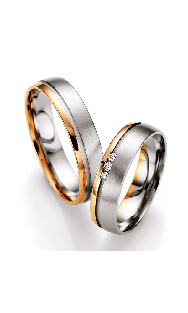 Zlaté snubné prstene vyrobené v kombinácii bieleho a ružového štrnásťkarátového zlata - 585/000 v pologuľatom profile v povrchovej úprave: biele zlato zamatovo matné - ružové zlato lesklé oddelené. V dámskom prsteni sú vsadené tri okrúhle diamanty briliantového brusu. Diamanty oplývajú svojou krásou a vlastnosťami, ktoré sú oproti iným kameňom bezkonkurenčné. Je to najtvrdší nerast, ktorý nikdy nestratí svoju hodnotu. Diamant je kráľ všetkých drahokamov a teda aj jedným z najcennejších a preto sa oplatí do šperkov s diamantmi investovať a predovšetkým pri snubných prsteňoch, ktoré sú na celý život!  Vsadzovanie diamantov vykonávajú naši najskúsenejší majstri zlatníci ručne pod mikroskopom s presnosťou na 0,01 mm a preto nehrozí vypadnutie kamienkov ako to býva u strojne vyrábaných snubných prsteňov. Snubné prstene majú vnútorný fit profil - zaoblenie vnútornej strany prsteňov.
