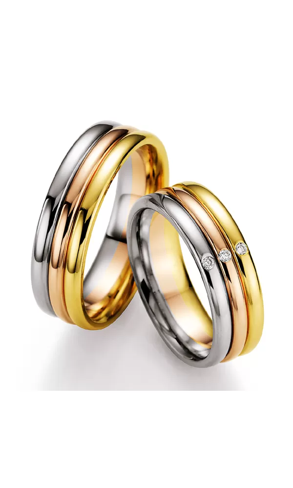 Originálne snubné prstene vyrobené v kombinácii bieleho, žltého a ružového štrnásťkarátového zlata - 585/000 v lesklej povrchovej úprave. V dámskom prsteni sú vsadené tri okrúhle diamanty briliantového brusu. Diamanty oplývajú svojou krásou a vlastnosťami, ktoré sú oproti iným kameňom bezkonkurenčné. Je to najtvrdší nerast, ktorý nikdy nestratí svoju hodnotu. Diamant je kráľ všetkých drahokamov a teda aj jedným z najcennejších a preto sa oplatí do šperkov s diamantmi investovať a predovšetkým pri snubných prsteňoch, ktoré sú na celý život! Vsadzovanie diamantov vykonávajú naši najskúsenejší majstri zlatníci ručne pod mikroskopom s presnosťou na 0,01 mm a preto nehrozí vypadnutie kamienkov ako to býva u strojne vyrábaných snubných prsteňov. Snubné prstene majú vnútorný fit profil - zaoblenie vnútornej strany prsteňov.