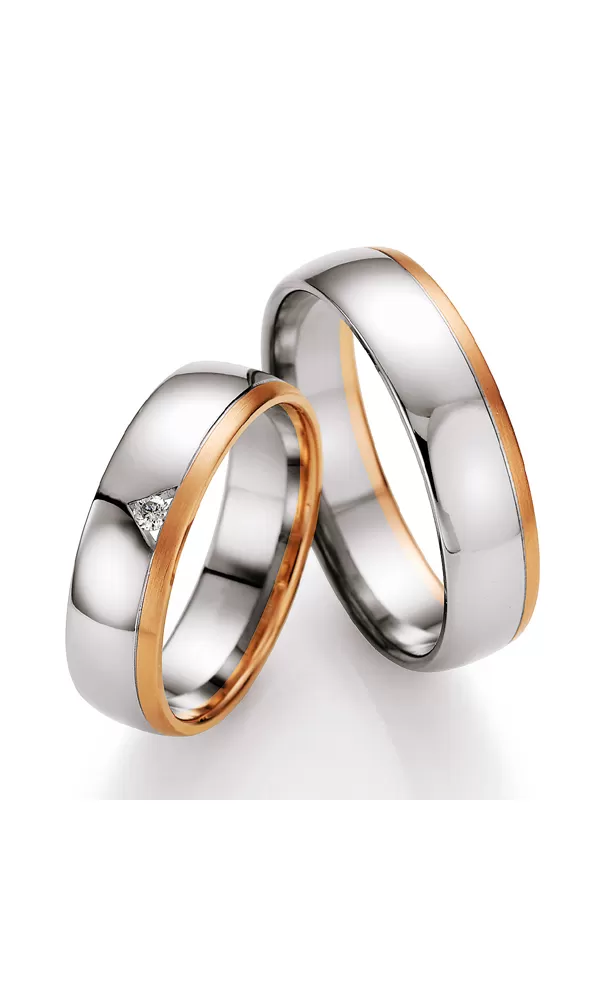 Zlaté snubné prstene vyrobené v kombinácii bieleho a ružového štrnásťkarátového zlata - 585/000 v pologuľatom profile. Širšia biela časť je zamatovo matná, užšia ružová časť je lesklá oddelená jemnou lesklou ryhou. V dámskom prsteni je vsadený jeden okrúhly diamant briliantového brusu. Diamanty oplývajú svojou krásou a vlastnosťami, ktoré sú oproti iným kameňom bezkonkurenčné. Je to najtvrdší nerast, ktorý nikdy nestratí svoju hodnotu. Diamant je kráľ všetkých drahokamov a teda aj jedným z najcennejších a preto sa oplatí do šperkov s diamantmi investovať a predovšetkým pri snubných prsteňoch, ktoré sú na celý život!  Vsadzovanie diamantov vykonávajú naši najskúsenejší majstri zlatníci ručne pod mikroskopom s presnosťou na 0,01 mm a preto nehrozí vypadnutie kamienkov ako to býva u strojne vyrábaných snubných prsteňov. Snubné prstene majú vnútorný fit profil - zaoblenie vnútornej strany prsteňov.
