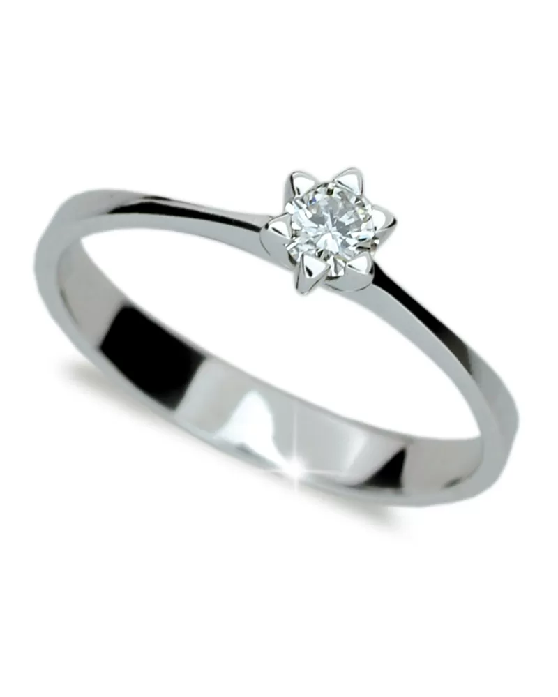 Krásny, dámsky prsteň s jedným okrúhlym diamantom, ktorý je usadený do šesťkrapňovej korunky. Diamant je v briliantovom bruse, ktorý zaisťuje maximálnu brilanciu vybrúsených facet, dokonale odráža svetlo a neuveriteľne žiari z každého uhla pohľadu! Vsadzovanie diamantov vykonávajú naši najskúsenejší majstri zlatníci ručne pod mikroskopom s presnosťou na 0,01mm a preto nehrozí vypadnutie kamienkov ako to býva u strojne vyrábaných príveskov. Šperk je vyrobený z bieleho štrnásťkarátového zlata - 585/1000 v lesklej povrchovej úprave.