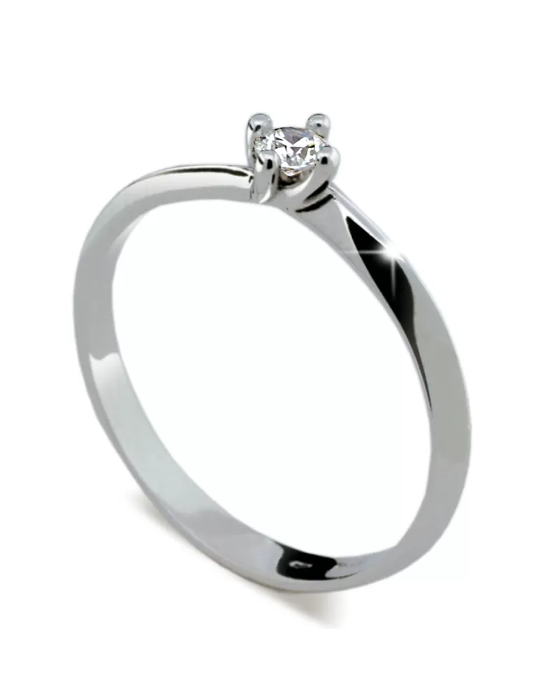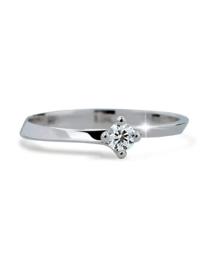 Dámsky prsteň tvorí elegantný obrúčka a zaujímavé usadený diamantu. Diamant je v briliantovom bruse, ktorý zaisťuje maximálnu brilanciu vybrúsených facet, dokonale odráža svetlo a neuveriteľne žiari z každého uhla pohľadu! Vsadzovanie diamantov vykonávajú naši najskúsenejší majstri zlatníci ručne pod mikroskopom s presnosťou na 0,01mm a preto nehrozí vypadnutie kamienkov ako to býva u strojne vyrábaných príveskov. Šperk je vyrobený z bieleho štrnásťkarátového zlata - 585/1000 v lesklej povrchovej úprave.