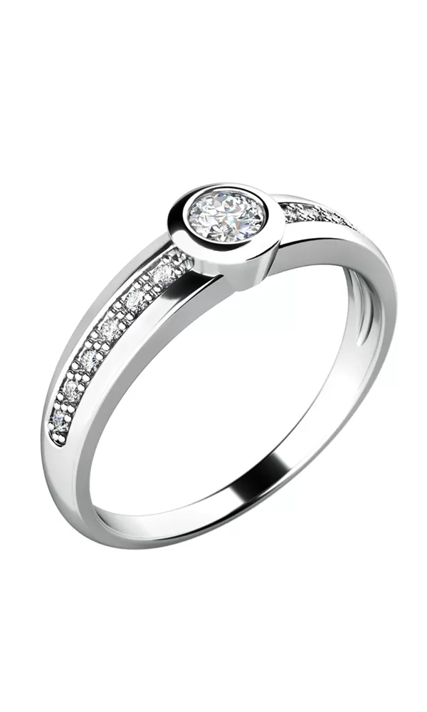 Luxusný zásnubný prsteň je vyrobený z bieleho štrnásťkarátového zlata - 585/1000 v lesklej povrchovej úprave. Prsteň je osadený trinástimi diamantmi vybrúsenými briliantovým brusom - jedným stredovým a po každej strane šiestimi menšími diamantmi.