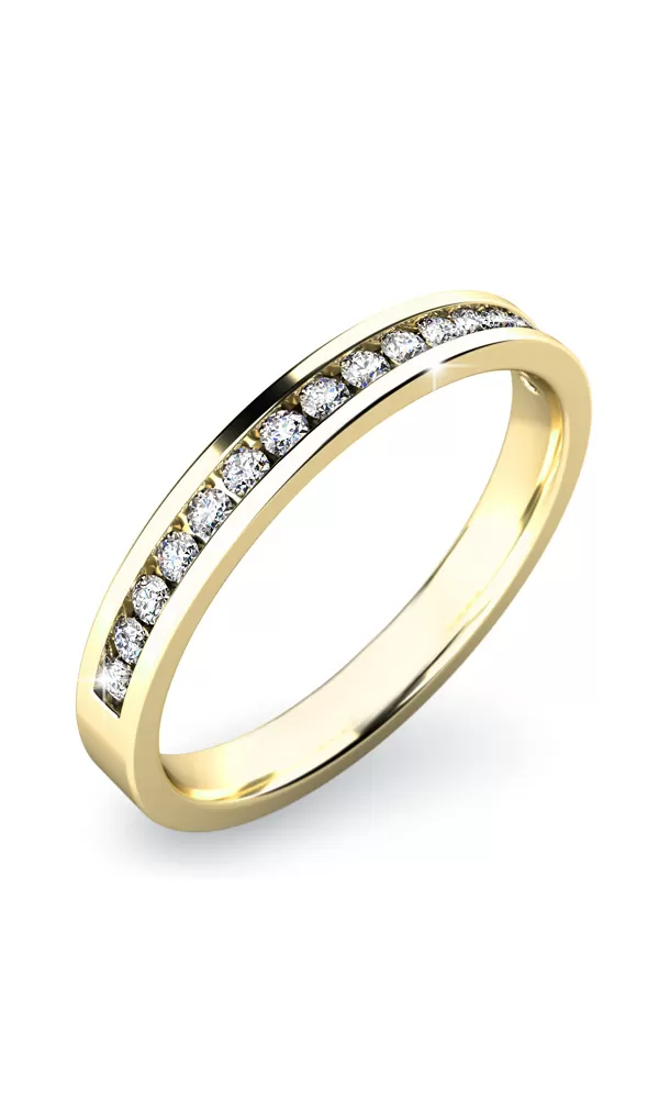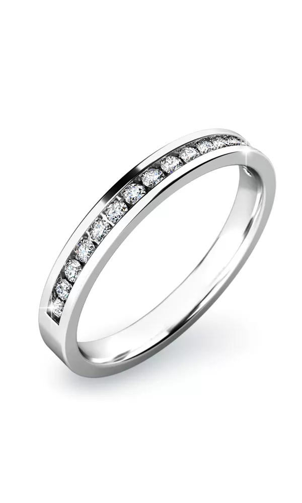 Prsteň vyrobený z bieleho štrnásťkarátového zlata - 585/1000 v lesklej povrchovej úprave. Tento prsteň je zdobený šestnástimi diamantmi briliantového brusu, ktoré sú vsadené do jednej línie. Prsteň pôsobí veľmi jemne a luxusne. Každá žena sa do neho zamiluje. Prsteň je možné kombinovať s inými prsteňmi a nosiť súčasne na jednom prste. Prsteň vyrábame a je skladom aj v žltom zlate.
