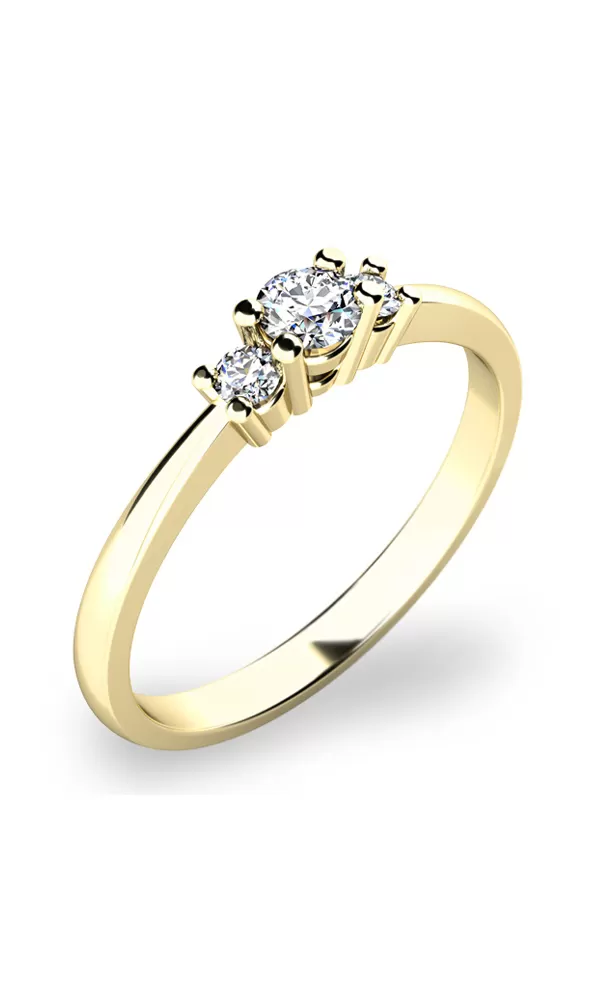 Jemný zásnubní prsten vyrobený ze čtrnáctikarátového zlata - 585/1000 v lesklé povrchové úpravě. Prsten je osazený třemi zářivými diamanty briliantového brusu do krapnového uchycení, které nechá vyniknout maximální brilanci kamenů.