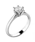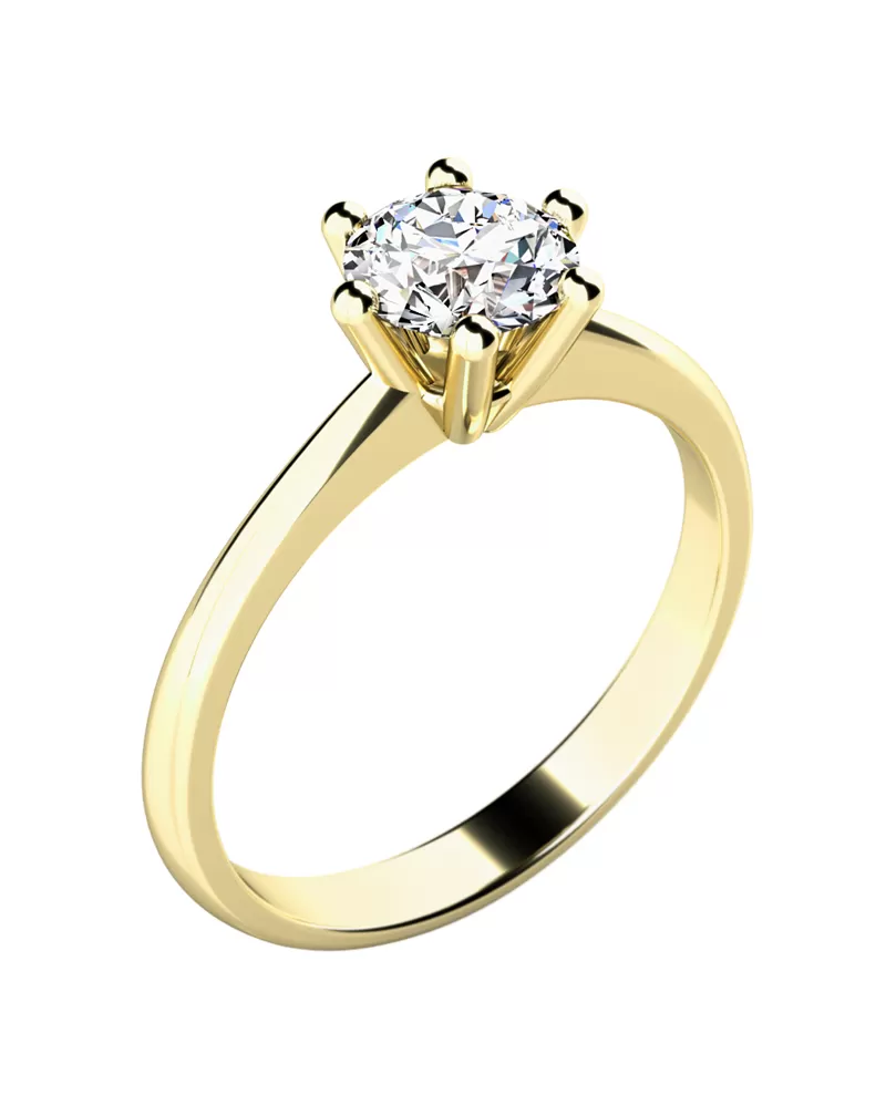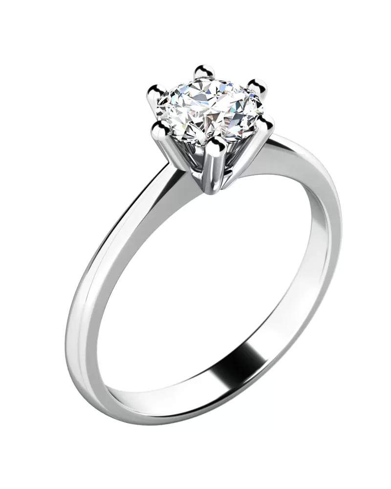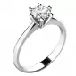 Luxusný zásnubný prsteň typu soliter je vyrobený z bieleho štrnásťkarátového zlata - 585/1000 v lesklej povrchovej úprave. Prsteň má jeden veľký okrúhly diamant briliantového brusu vsadený do šesťkrapnovej korunky.