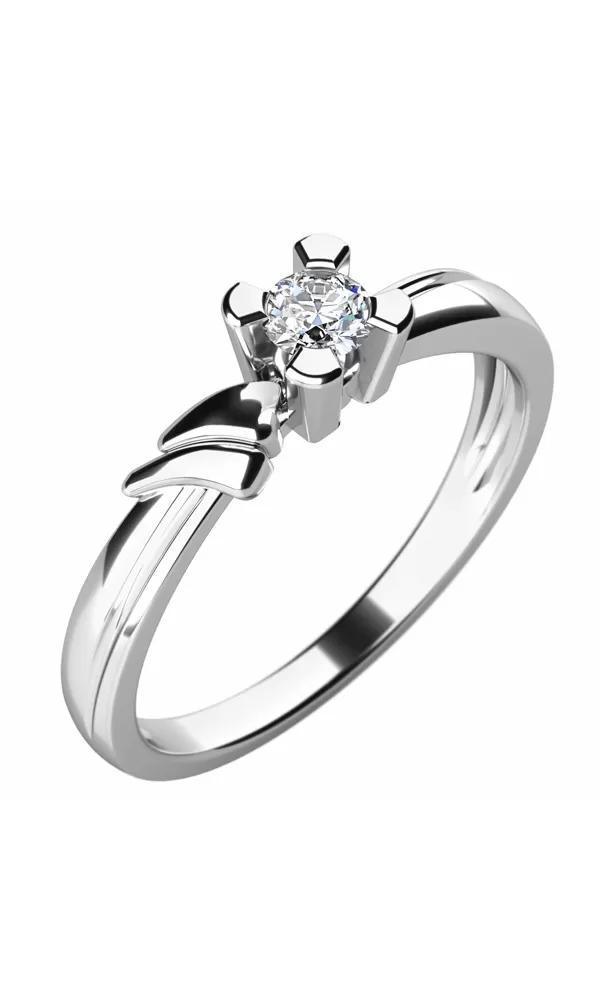 Krásny zásnubný prsteň je vyrobený z bieleho štrnásťkarátového zlata - 585/1000 v lesklej povrchovej úprave. Prsteň má jeden okrúhly diamant briliantového brusu vsadený do štvorkrapňovej korunky.