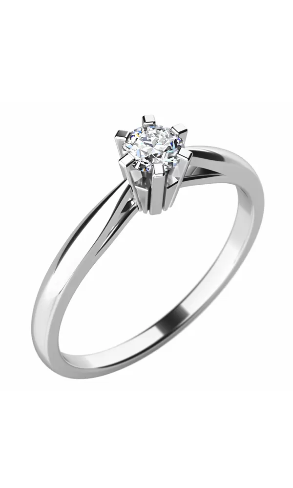 Krásny zásnubný prsteň je vyrobený z bieleho štrnásťkarátového zlata - 585/1000 v lesklej povrchovej úprave. Prsteň má jeden okrúhly diamant vsadený do šesťkrapnovej korunky.