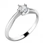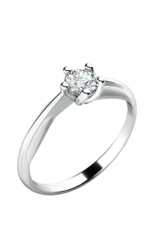 Romantický zásnubný prsteň je vyrobený z bieleho štrnásťkarátového zlata - 585/1000 v kombinácii lesklej a matnej povrchovej úpravy. Prsteň má jeden okrúhly diamant briliantového brusu vsadený do zakrútenej petikrapnovej korunky. Vsadzovanie diamantov vykonávajú naši najskúsenejší majstri zlatníci ručne pod mikroskopom s presnosťou na 0,01mm a preto nehrozí vypadnutie kamienkov ako to býva u strojne vyrábaných zásnubných prsteňov.