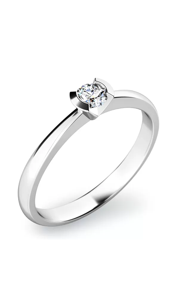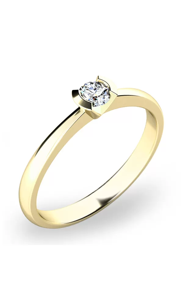 Jemný zásnubní prsten vyrobený ze čtrnáctikarátového zlata - 585/1000 v lesklé povrchové úpravě. Prsten má jeden diamant kulatého brusu, který je uchycený do korunky ve tvaru písmene V. Prsten je čistého designu v klasickém provedení, který patří stále k nejoblíbenějším typům zasnubních prstenů.