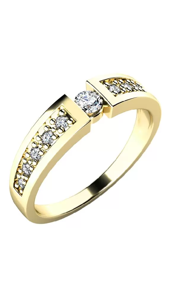 Luxusný zásnubný prsteň je vyrobený zo žltého štrnásťkarátového zlata - 585/1000 v lesklej povrchovej úprave. Obrúčka prsteňa je spojená jedným väčším hlavným zirkónom a po každej strane je v obrúčke vsadených päť menších zirkónov. Všetky zirkóny majú briliantový brus Signity star, ktorý zaisťuje maximálnu brilanciu kameňov. Vďaka skladbe a štýlovo čistému vsadeniu zirkónov, prsteň vyniká krásnou brilanciou kameňov. Vsadzovanie zirkónov do zásnubných prsteňov vykonávajú naši najskúsenejší majstri zlatníci ručne pod mikroskopom s presnosťou na 0,01mm a preto nehrozí vypadnutie kamienkov ako to býva u strojne vyrábaných zásnubných prsteňov.