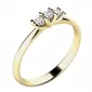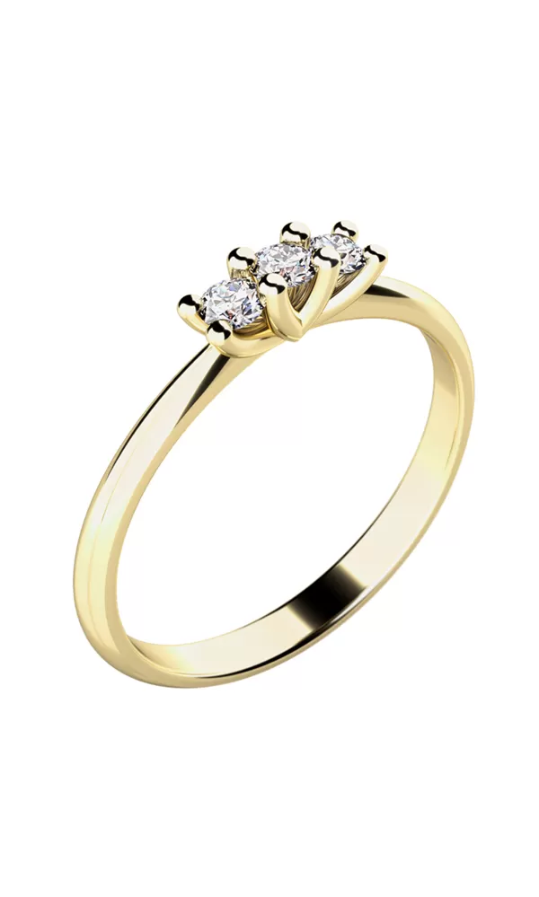 Zásnubný prsteň je vyrobený zo žltého štrnásťkarátového zlata - 585/1000 v lesklej povrchovej úprave. Prsteň je osadený tromi žiarivými zirkónmi do krapňového uchytenia, ktoré nechá vyniknúť maximálnu brilanciu kameňov. Zirkóny majú briliantový brus Signity star, ktorý zaisťuje maximálnu brilanciu kameňov. Vďaka skladbe a štýlovo čistému vsadeniu zirkónov, prsteň vyniká krásnou brilanciou kameňov. Vsadzovanie zirkónov do zásnubných prsteňov vykonávajú naši najskúsenejší majstri zlatníci ručne pod mikroskopom s presnosťou na 0,01mm a preto nehrozí vypadnutie kamienkov ako to býva u strojne vyrábaných zásnubných prsteňov.