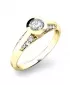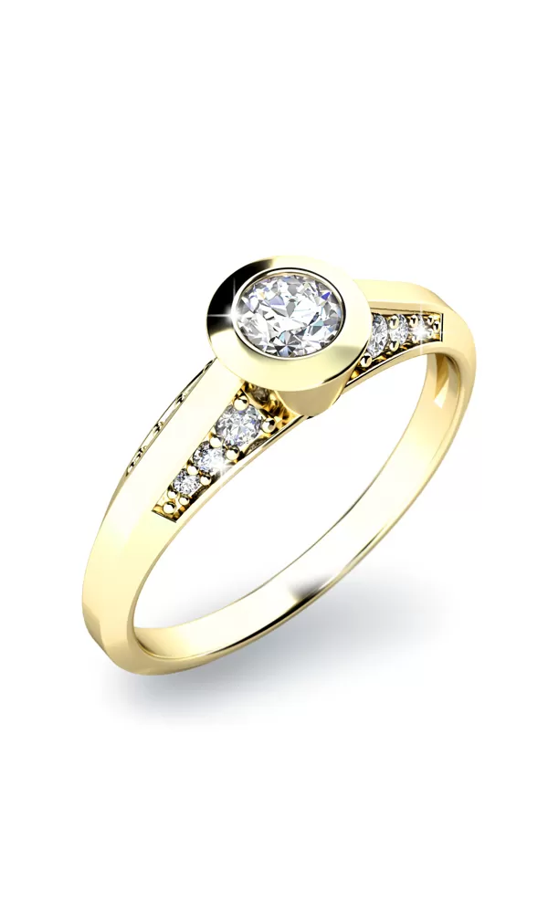 Elegantný zásnubný prsteň vyrobený zo žltého štrnásťkarátového zlata - 585/1000 v lesklej povrchovej úprave. Prsteň je osadený zirkónmi, jedným… Celý popis