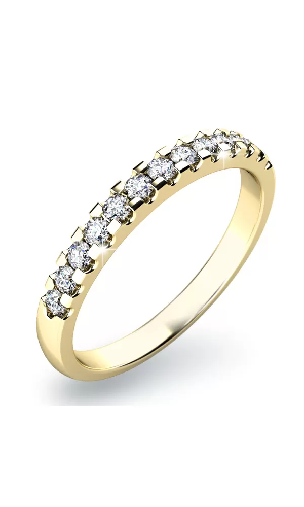 Prsteň vyrobený zo žltého štrnásťkarátového zlata - 585/1000 v lesklej povrchovej úprave. V prsteni je vsadených trinásť zirkónov briliantového brusu, ktoré sú vsadené do jednej línie. Všetky zirkóny majú briliantový brus Signity star, ktorý zaisťuje maximálnu brilanciu kameňov. Vďaka skladbe a štýlovo čistému vsadeniu zirkónov, prsteň vyniká krásnou brilanciou kameňov. Vsadzovanie zirkónov do zásnubných prsteňov vykonávajú naši najskúsenejší majstri zlatníci ručne pod mikroskopom s presnosťou na 0,01 mm a preto nehrozí vypadnutie kamienkov ako to býva u strojne vyrábaných zásnubných prsteňov. Prsteň pôsobí veľmi jemne a luxusne. Každá žena sa do neho zamiluje. Prsteň je možné kombinovať s inými prsteňmi a nosiť ich súčasne na jednom prste.
