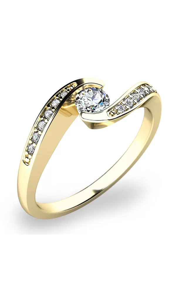 Elegantný zásnubný prsteň je vyrobený zo žltých štrnástich -karatových zlatých - 585/1000 v lesklom povrchu. Prsteň má mierne skrútené čiary, ktoré sa spájajú v strede a lemujú stredný väčší zirkón. Rám je vysadený v hornej časti ďalšími menšími zirkónmi. Všetky zirkóny majú vynikajúcu hviezdu podpisu, ktorá poskytuje maximálnu brilanciu kameňov. Vďaka kompozícii a štýlovo čistému vloženiu zirkónov prsteň vyniká v krásnej brilancii kameňov. Nastavenie zirkónov do zásnubných krúžkov vykonávajú naši najskúsenejší majstri rukou ručne pod mikroskopom s presnosťou 0,01 mm, a preto neohrozí, že kamene padajú, ako sú zásnubné krúžky vytvorené strojom. Tento tvar kruhu je veľmi obľúbený s jeho atypickým a moderným vzhľadom.