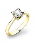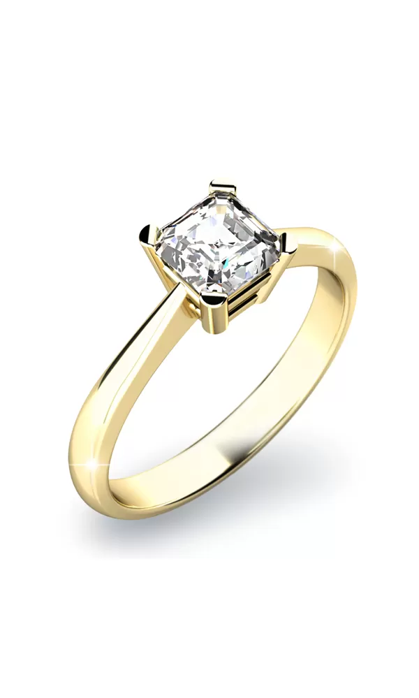 Zásnubný prsteň je vyrobený zo žltého štrnásťkarátového zlata - 585/1000 v lesklej povrchovej úprave. Prsteň má jeden zirkón štvorcového brusu typu Radiant, ktorý je uchytený do štvorkrapňovej korunky. Prsteň je čistého dizajnu v klasickom prevedení, ktorý patrí stále k najobľúbenejším typom zasnubných prsteňov.