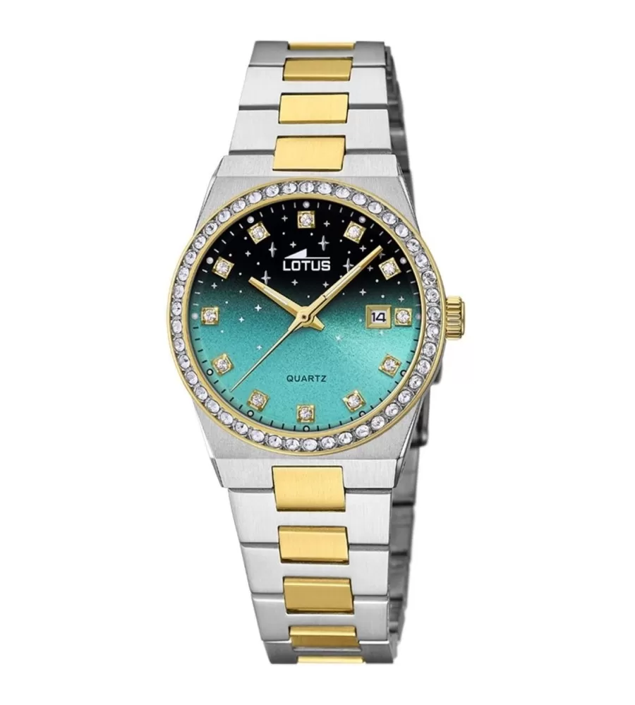 Dámske hodinky Lotus sú elegantné hodinky s klasickým okrúhlym dizajnom, zeleným čiernym číselníkom a dekoratívnymi zirkónmi na ráme. Majú funkciu pohybu batérie a displeja údajov. Vďaka vodotesnému 10ATM sú vhodné nielen pre neformálne opotrebenie, ale aj na kúpanie. Puzdro s priemerom 32 mm je vyrobené z nehrdzavejúcej ocele s ošetrením PVD a remienok je oceľový biokolor s klikatou sponou. Tento model je vhodný pre ženy, ktoré chcú štýlový a praktický doplnok pre každodenné nosenie a pre spoločenské príležitosti.