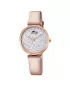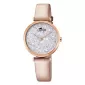 Nežne romantické hodinky v zlatom prevedení s nádychom ružového zlata, číselník je posiaty kamienkami plného lesku. Remienok je v ružovom odtieni zlata, sklíčko je minerálne.