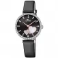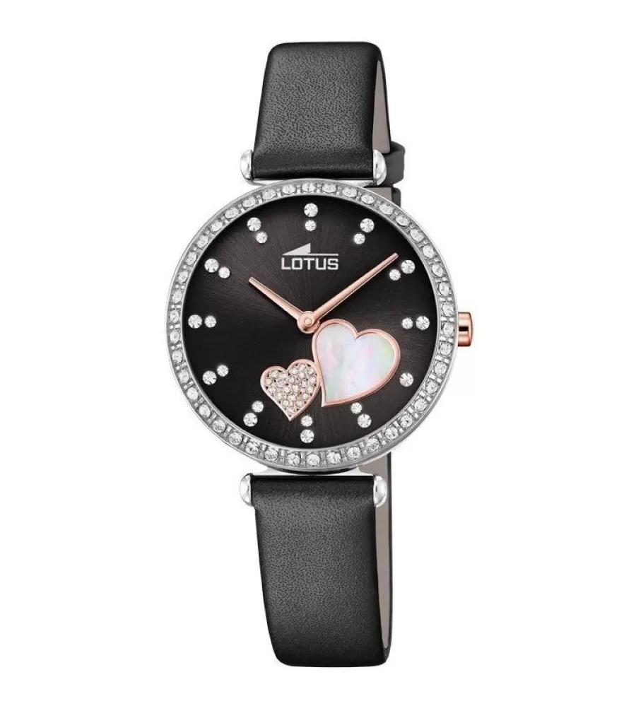 Dámske hodinky majú kremeňový pohyb a okrúhle puzdro z nehrdzavejúcej ocele s priemerom 29 mm. Diama je čierna, zdobená zirkónmi so zaujímavou aplikáciou na tvare srdca, a to všetko je naladené jemnou dekoráciou v matke -f -perlel a ružovej farbe zlata. Popruh je čierny, vyrobený z pravej kože končí klasickou prackou.