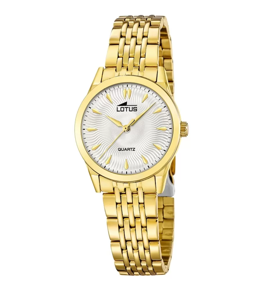 Dámske hodinky Lotus Classic Bracelet L19059/1 pôsobí elegantným a nadčasovým dojmom, ktorý sa hodí na každodenné nosenie aj formálnejšie príležitosti. Majú klasický analógový ciferník v čistom a prehľadnom prevedení, ktorý zaisťuje ľahkú čitateľnosť času. Kovové puzdro aj náramok v zlatom tóne dodávajú modelu jemnú eleganciu a univerzálnosť. Minerálne sklíčko chráni ciferník pred drobnými škrabancami a bežným opotrebovaním. Hodinky sú navrhnuté tak, aby pohodlne sedeli na zápästí a zároveň podčiarkli ženský štýl. Celkový dizajn kombinuje jednoduchosť, praktickosť a vkusný luxus.