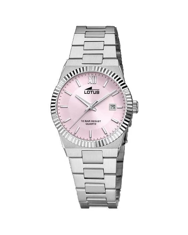 Klasické dámske hodinky Lotus s výborne čitateľným ciferníkom. Ciferník je v ružovej farbe disponujúcej ukazovateľom dátumu.