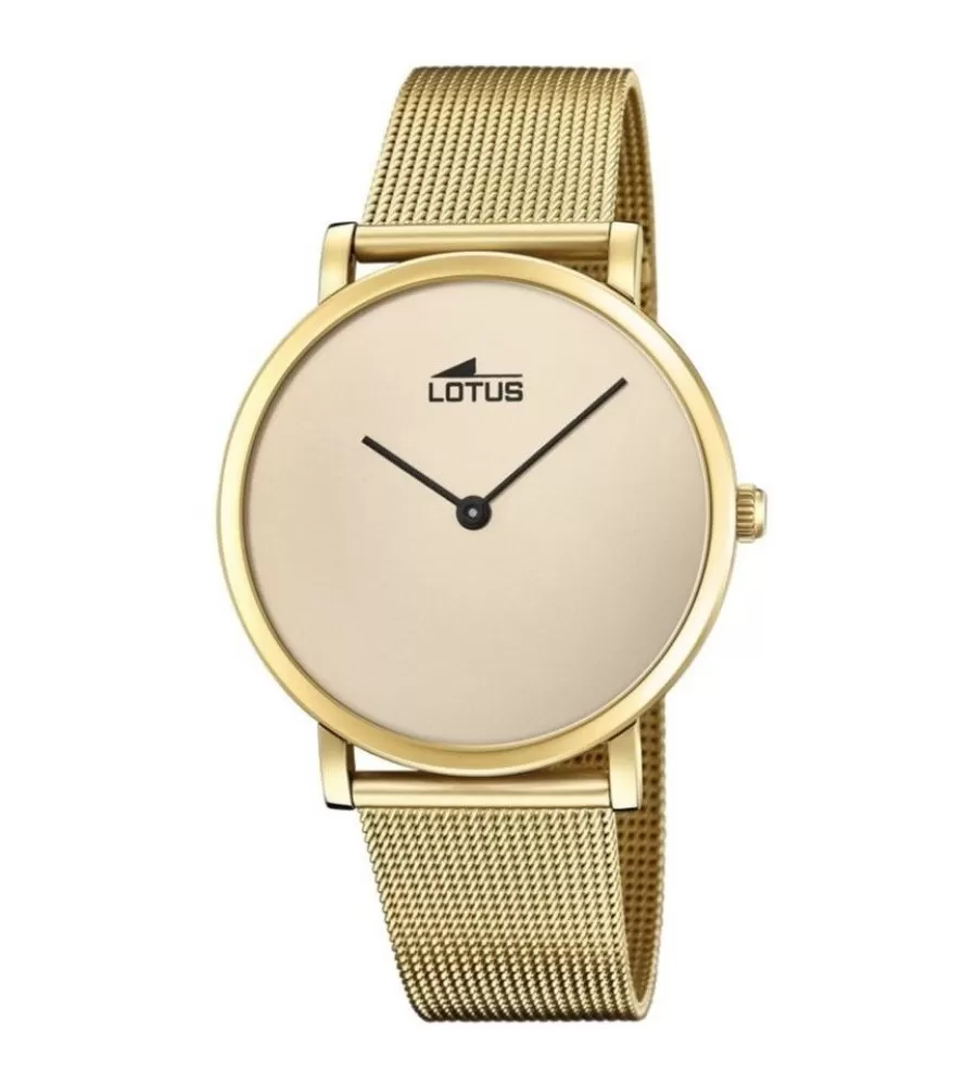 Hodinky Lotus L18772/1 z kolekcie Minimalist vynikajú čistým a moderným dizajnom, ktorý stavia na jednoduchosti a nadčasovej elegancii. Dominantou je zlatý ciferník bez zbytočných prvkov, doplnený iba jemnými indexmi a tenkými ručičkami, vďaka čomu pôsobí veľmi prehľadne a sofistikovane. Puzdro z kvalitnej nerezovej ocele s PVD úpravou zaisťuje vysokú odolnosť a dlhú životnosť. Naň nadväzuje štýlový milánsky ťah v rovnakej farebnej úprave, ktorý sa pohodlne prispôsobí zápästiu a dodáva hodinkám moderný vzhľad.