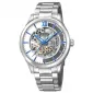 Pánske hodinky na oceľovom strojčeku, ktoré na prvý pohľad upútajú skeletonizovaným ciferníkom, ktorý ponúka pohľad na mechanický strojček s automatickým náťahom. Ciferník s modrými ručičkami a indexmi je chránený zafírovým sklom.
