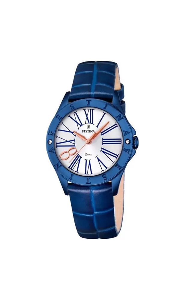 Dámske módne hodinky Festina v analógovom zobrazení času. Hodinky zaujmú na prvý pohľad svojim elegantným a originálnym vzhľadom. Hodinky majú kožený remienok v modrej farbe a ciferník okrúhleho tvaru v bielej farbe. Puzdro je krásne zdobené žiarivými kamienkami. Švajčiarska značka hodiniek FESTÍNA vyniká svojim moderným dizajnom a prvotriednou kvalitou. A to všetko za veľmi priaznivú cenu.