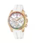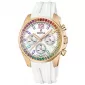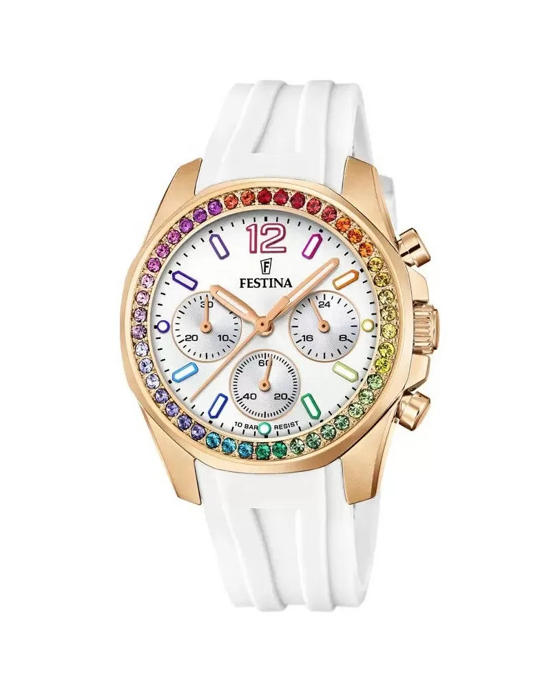 Moderné hodinky Festina majú puzdro vyrobené z chirurgickej ocele, ktorá je známa svojimi skvelými vlastnosťami. Oceľ je veľmi pevná, húževnatá a antialergická. Tento model dámskych hodiniek poteší ženy, ktoré si potrpia na dokonalé hodinky. Hodinky totiž majú biely remienok z kaučuku v kombinácii s pozláteným puzdrom vo farbe ružového zlata doplnené o trblietavé zirkóny vo farbách dúhy.