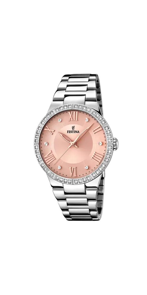Luxusné dámske hodinky FESTÍNA z kolekcie TREND. Hodinky sú z ocele v striebornej farbe s ružovým ciferníkom a puzdro je navyše osadené trblietavými kamienkami, ktoré dodajú hodinkám ten správny šmrnc.